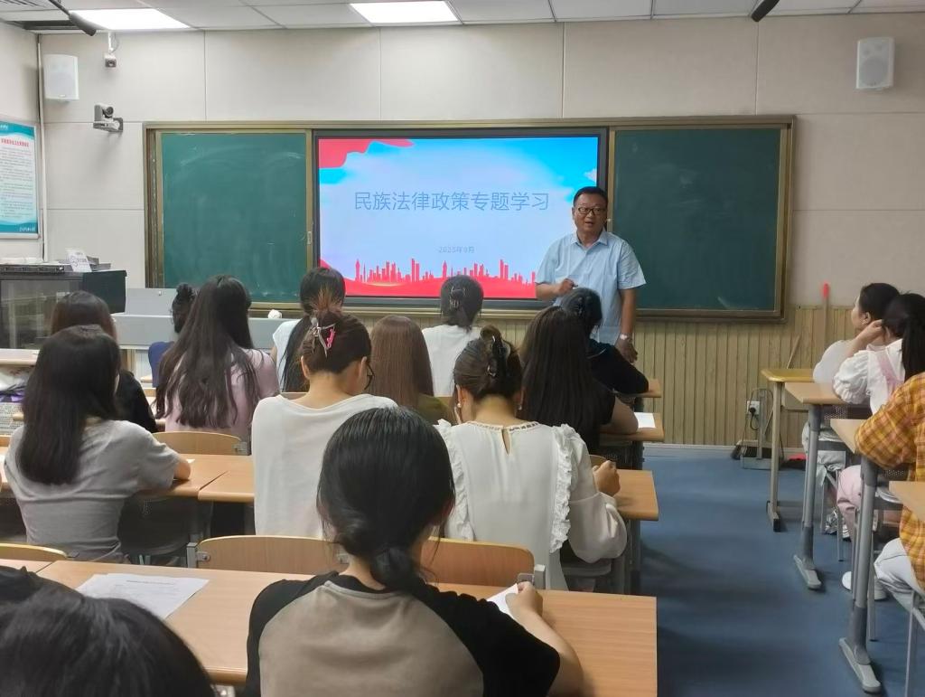 活动开始前,学院进行了周密准备,确保活动内容系统全面、重点突出。活动中,杨爱民书记首先带领全体师生深入学习习近平新时代中国特色社会主义思想,系统阐释了习近平总书记关于民族工作的重要论述,强调要准确把握民族工作的政治方向和时代要求。随后,在爱国主义专题教育环节,杨书记结合《中华人民共和国爱国主义教育法》等相关法律法规进行了系统讲解,指出爱国主义与民族政策深度融合是推进民族团结进步的重要保障,维护国家统一和民族团结是每位师生必须牢记的核心价值。最后,杨书记以“铸牢中华民族共同体意识”为主题,从历史脉络出发作了专题讲解,强调这一意识是新时代民族工作的主线,鼓励同学们坚定理想信念,传承红色基因,将个人理想融入国家与民族事业中,担当起新时代青年的责任与使命。